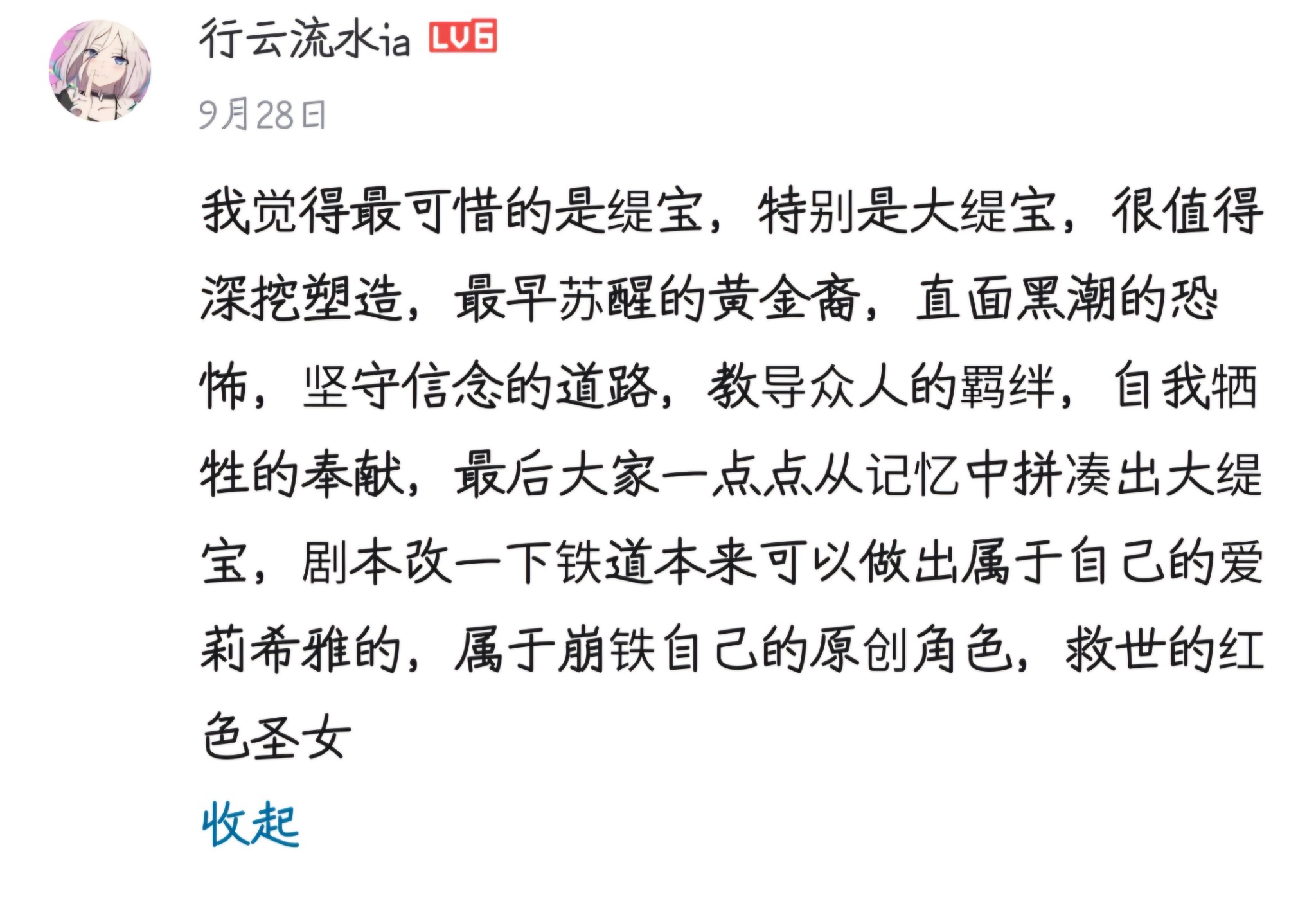 今天在逛B站的時候看到這個,我覺得這個說法挺好的,其實我也很喜歡緹寶,尤其是緹里西庇俄斯真的是很本格那種真心為自己的信仰和同伴犧牲奉獻的聖女,緹寶那段明天見也是目前翁法羅斯我最喜歡的劇情,結果偏偏到最後神愛世人這個元素被放在了一個跟主角之外其他同伴互動極少的人身上,昔漣但凡前面多出來跟其他黃金裔互動我都不會這麼可惜