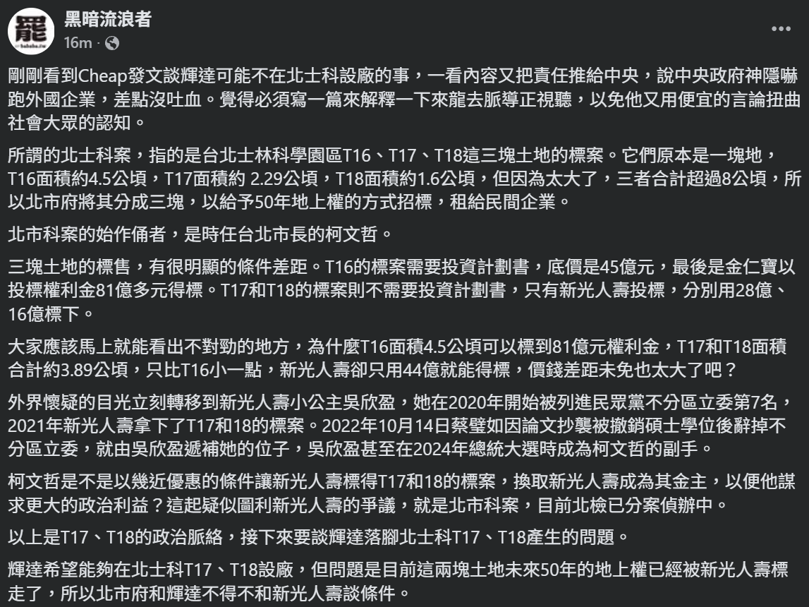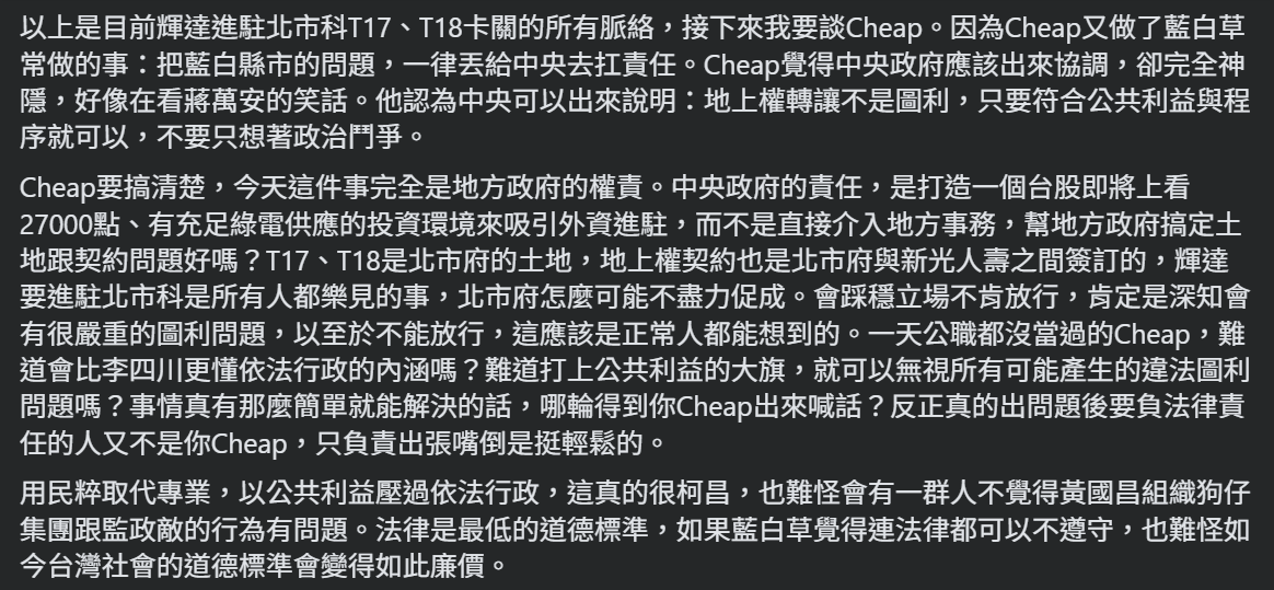 再者,這篇和cheap都有一點預設輝達一定要在北士科T17-18,而且只要地上權這有點怪。資料中心的部分GOOGLE有前例是在彰濱,第二個會在台南產業園區,土地買斷,經濟部工業局去協調。