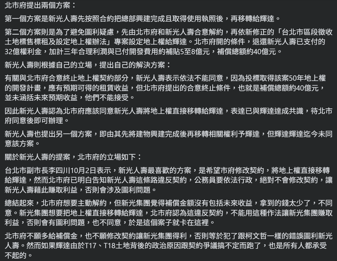 如果柯市府和新光的約有問題,包含賤價約或新光覺得解約要補未來利益等,那要解決的是這個約本身,而不是輝達的土地需求。畢竟談的還是公家的地。