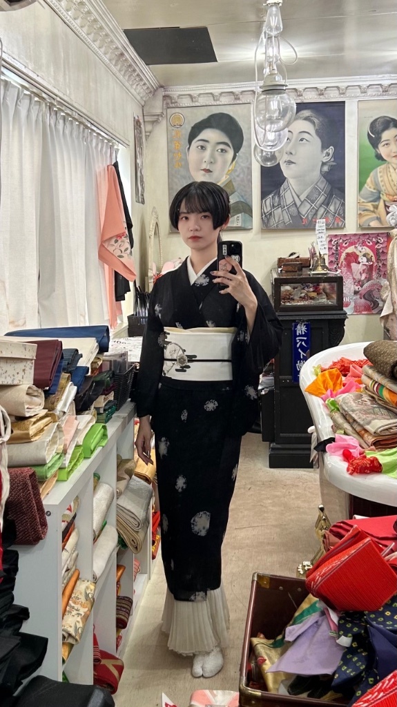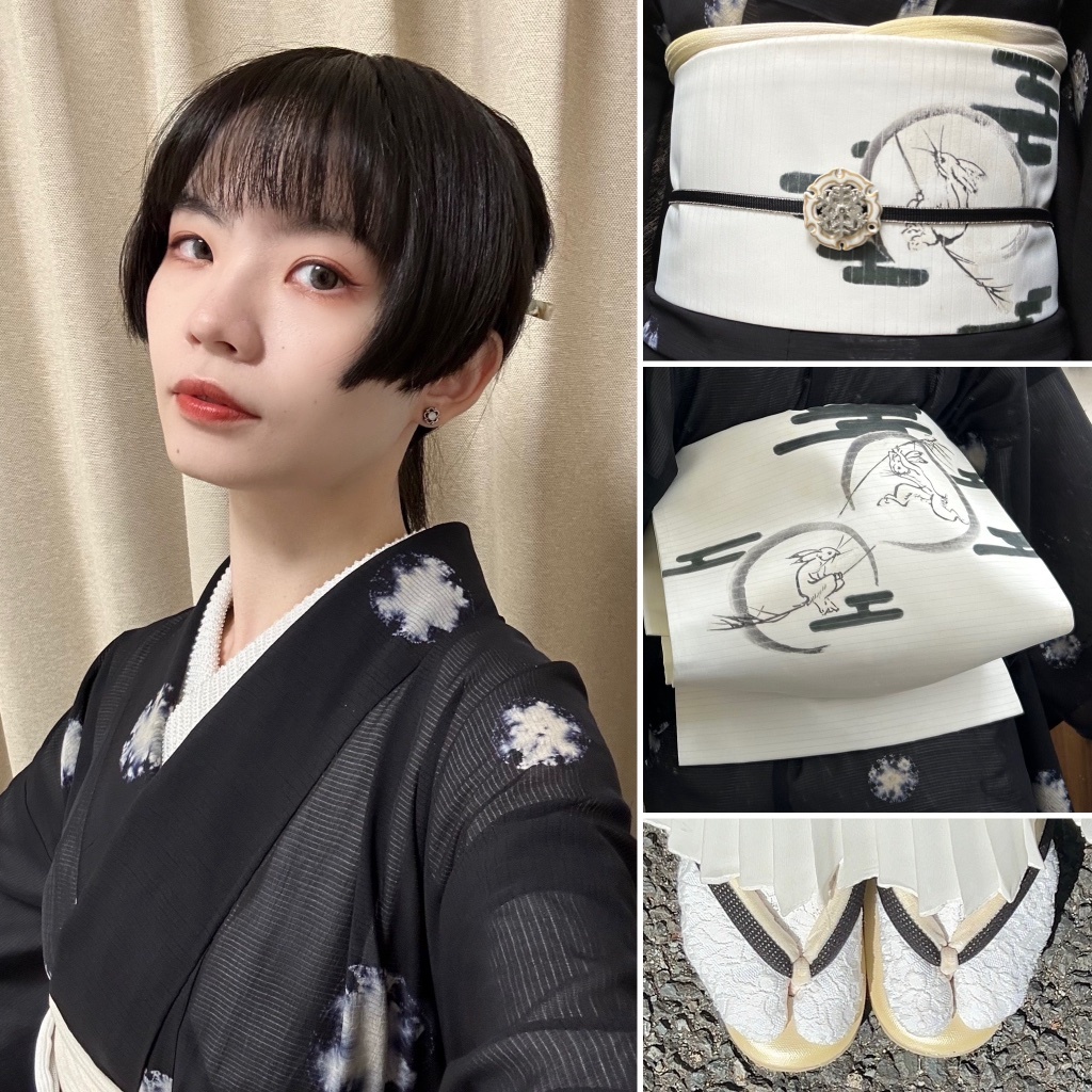 因為今天也是日本的中秋(十五夜),但是天氣還很熱所以選了雪輪圖藍染夏季小紋和服配上鳥獸戲畫風月兔圖腰帶,串珠半衿、雪輪跟雪花帶留兩個疊帶