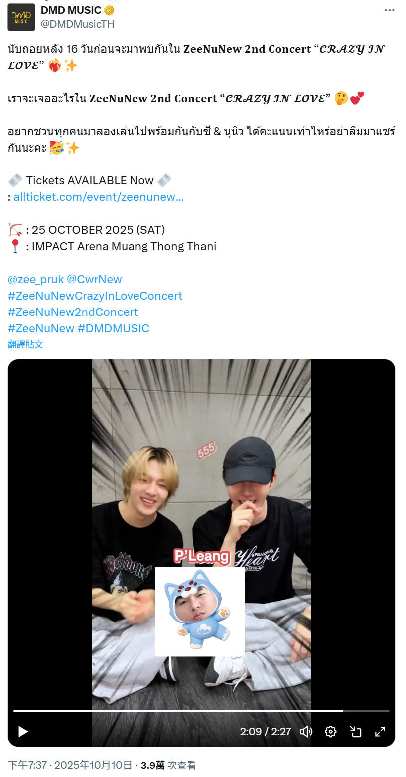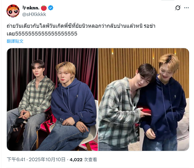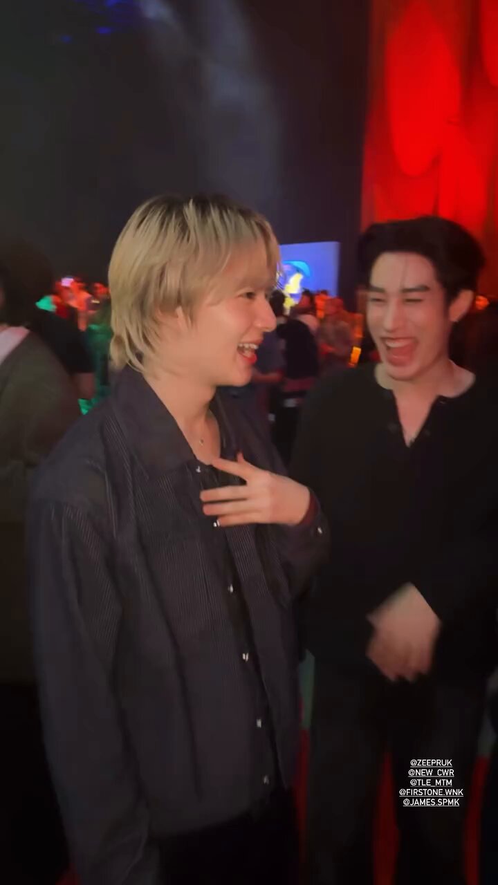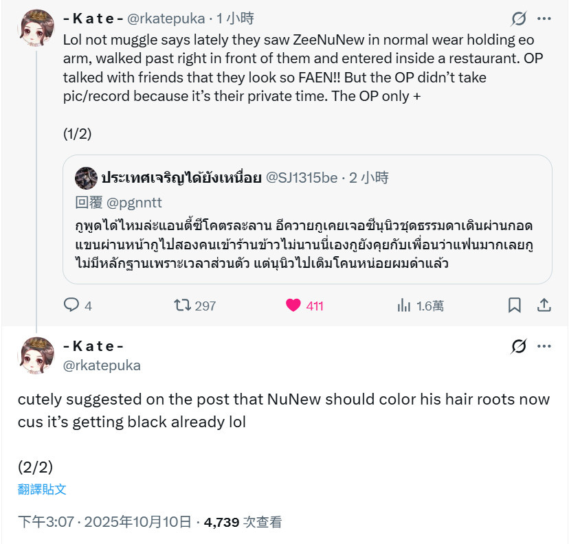 「哈哈哈,粉絲說最近看到ZeeNuNew穿著便裝挽著手臂,直接從他們面前走過進了一家餐廳。發帖人和朋友激動議論說他們看起來超!!級!!帥!!但發帖人沒有拍照/錄影,因為覺得那是他們的私人時間,只是可可愛愛地在帖子裡建議說NuNew該染頭髮了啦,因為髮根已經變黑了呢~」