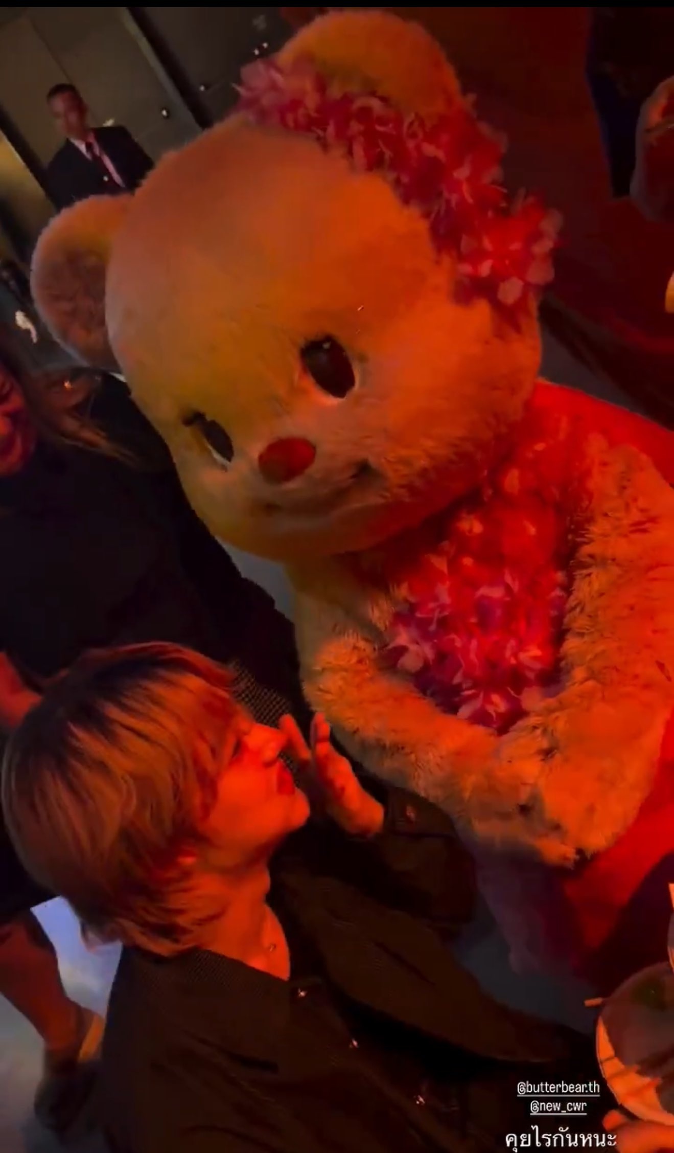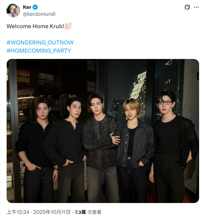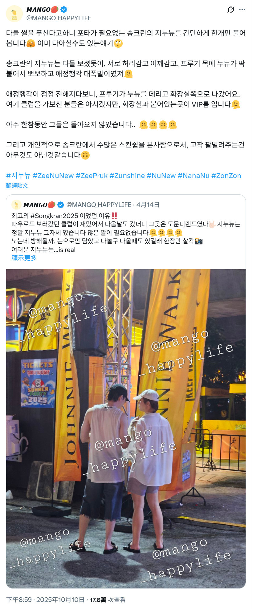 「哈哈哈,粉絲說最近看到ZeeNuNew穿著便裝挽著手臂,直接從他們面前走過進了一家餐廳。發帖人和朋友激動議論說他們看起來超!!級!!帥!!但發帖人沒有拍照/錄影,因為覺得那是他們的私人時間,只是可可愛愛地在帖子裡建議說NuNew該染頭髮了啦,因為髮根已經變黑了呢~」