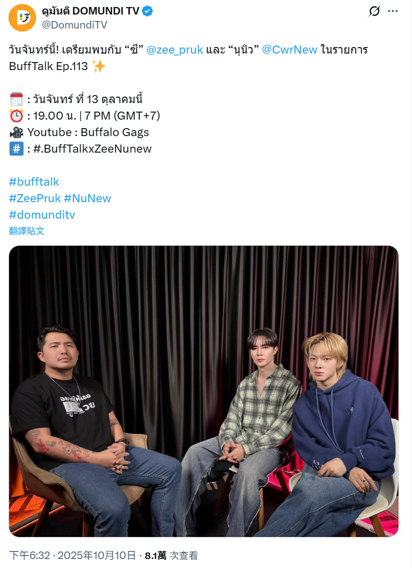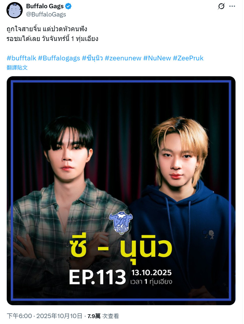 本週一!敬請期待 Zee 和 NuNew到節目BuffTalk Ep.113 做客✨