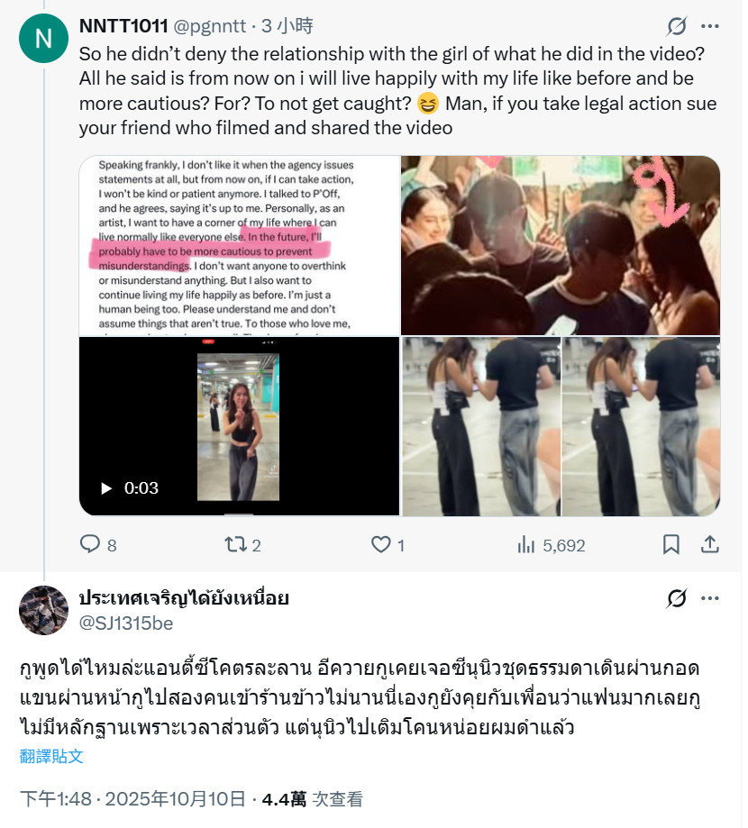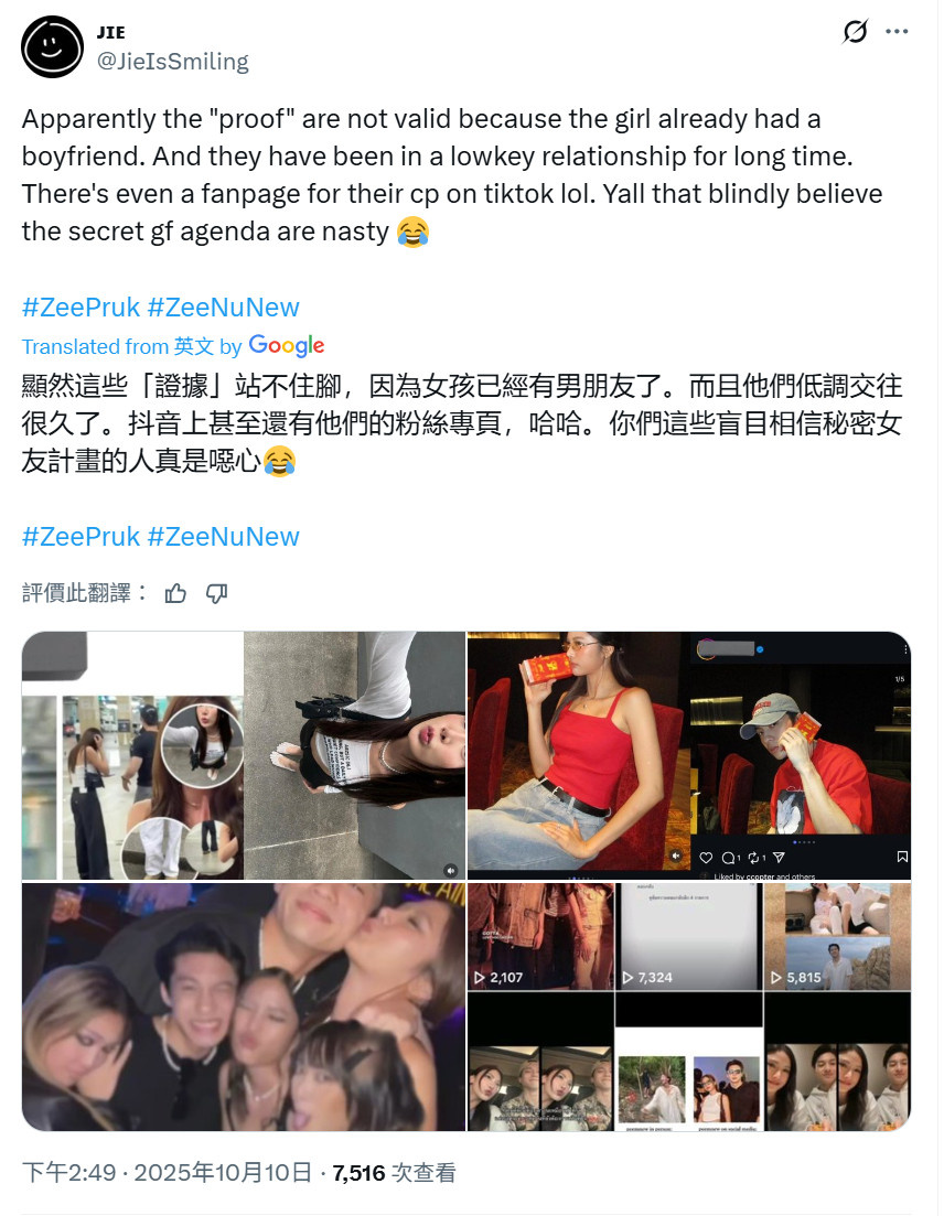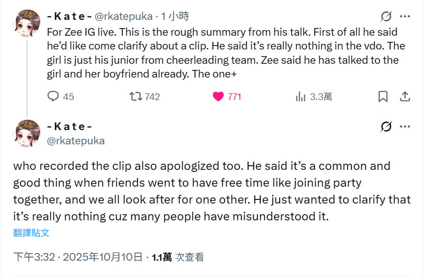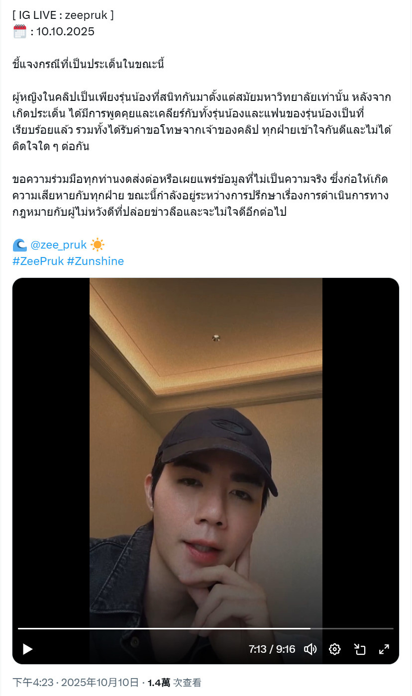 Zee表示影片裡的Nong是大學啦啦隊時期就認識的學妹,當時只是單純送她上車,什麼都沒有。他已經和Nong以及Nong的faen談過了,因為他不想任何人有誤解。發佈影片的人不認識他,對方也沒有惡意,不是故意的,只是誤會,現在已經和他道歉了。