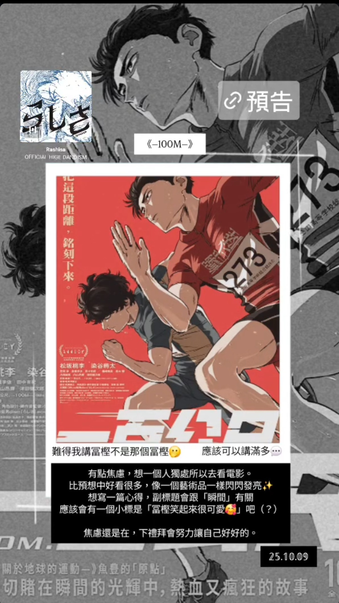 前天去看了《一百公尺》,想寫一點東西可是還沒開始(希望不會窗