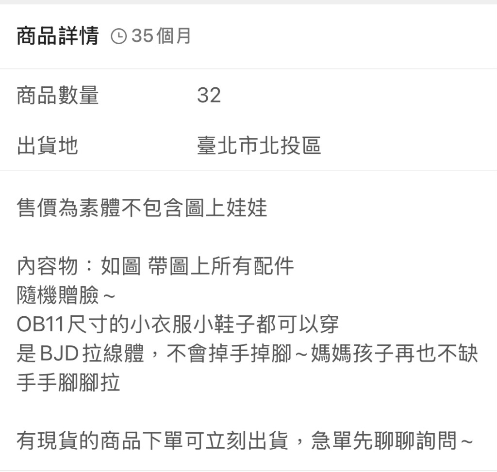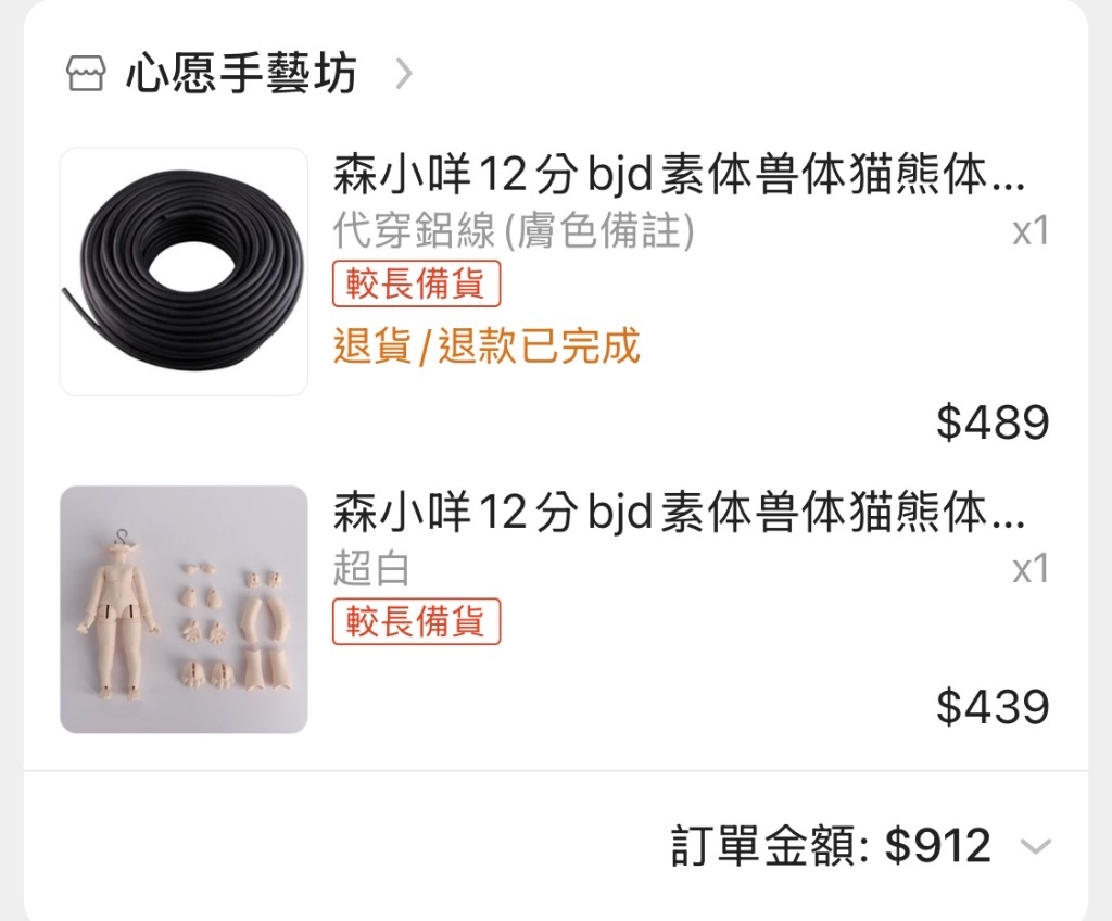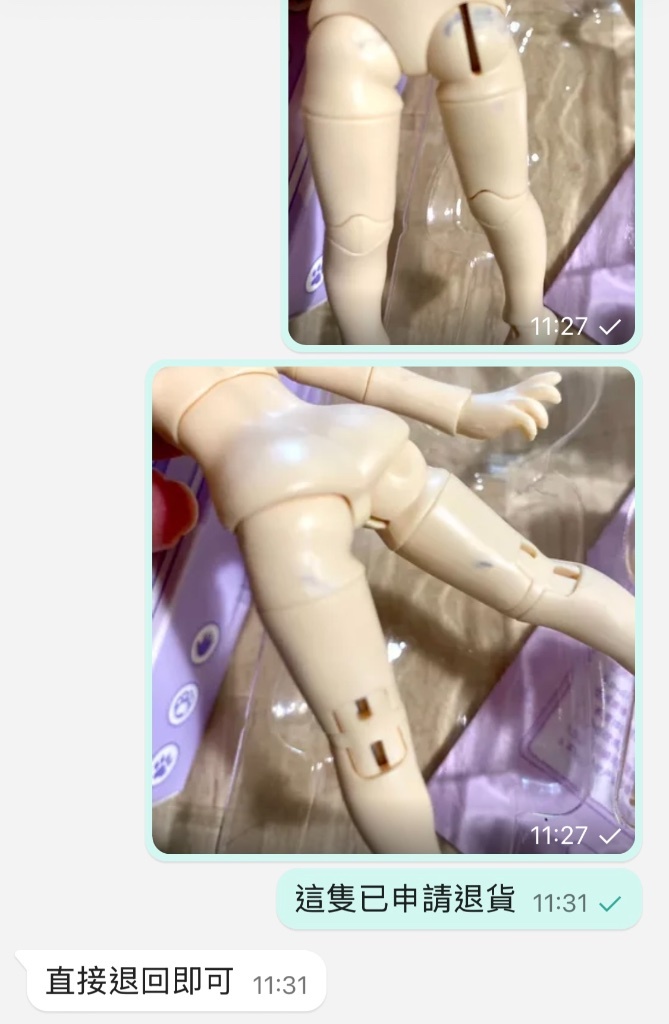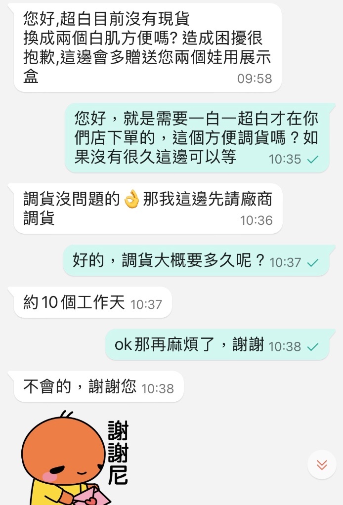 下單後賣家跟我說超白肌沒貨,問我兩隻白肌好嗎?我不想(要組cp膚色無法妥協),便主動詢問可否調貨