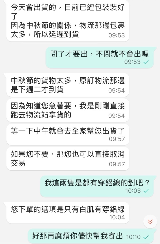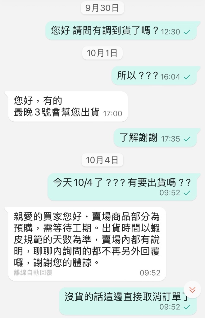 10天過去,沒消沒息,問了幾次終於回覆最晚10/3會寄出,結果10/4還是沒寄出,說要取消訂單之後才終於趕快幫我寄了