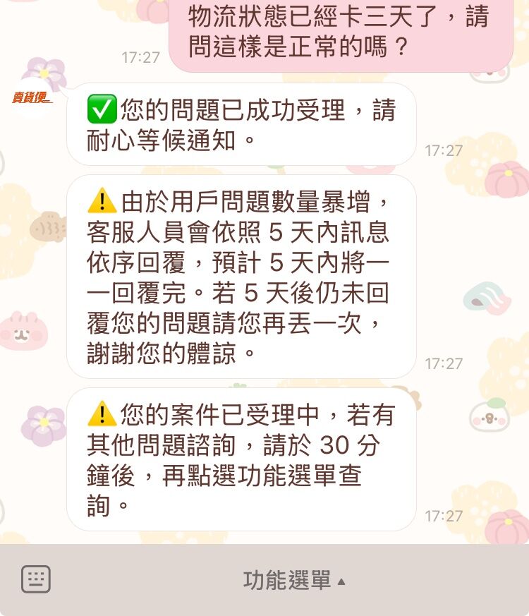 已詢問賣貨便客服,最近物流量大,我也有包裹卡在物理中心三天了,可能還是要再等個兩天看看