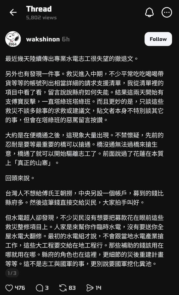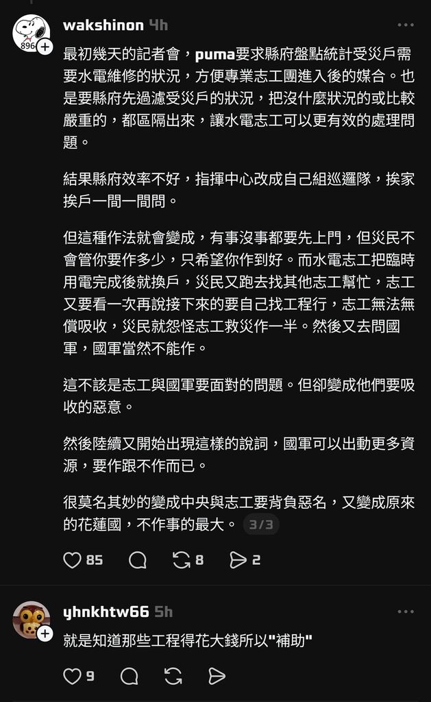 但水電超人卻發現,不少災民沒有想要把募款花在眼前這些救災整修項目上。人家是來幫你作臨時水電,沒有要送你全屋水電大翻修。最初的水電組才說,不會跟當地水電產業搶工作,這些大工程要交給在地工程行。那些補助的錢該用在哪就用在哪。縣府的角色也在這裡,更細節的災後重建計畫等等。這不是志工與國軍的事,更別說要國軍挖化糞池。