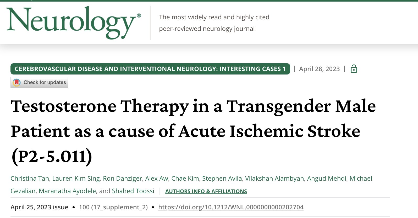 :【跨性別男性患者接受睪固酮治療導致急性缺血性中風 (P2-5.011)】