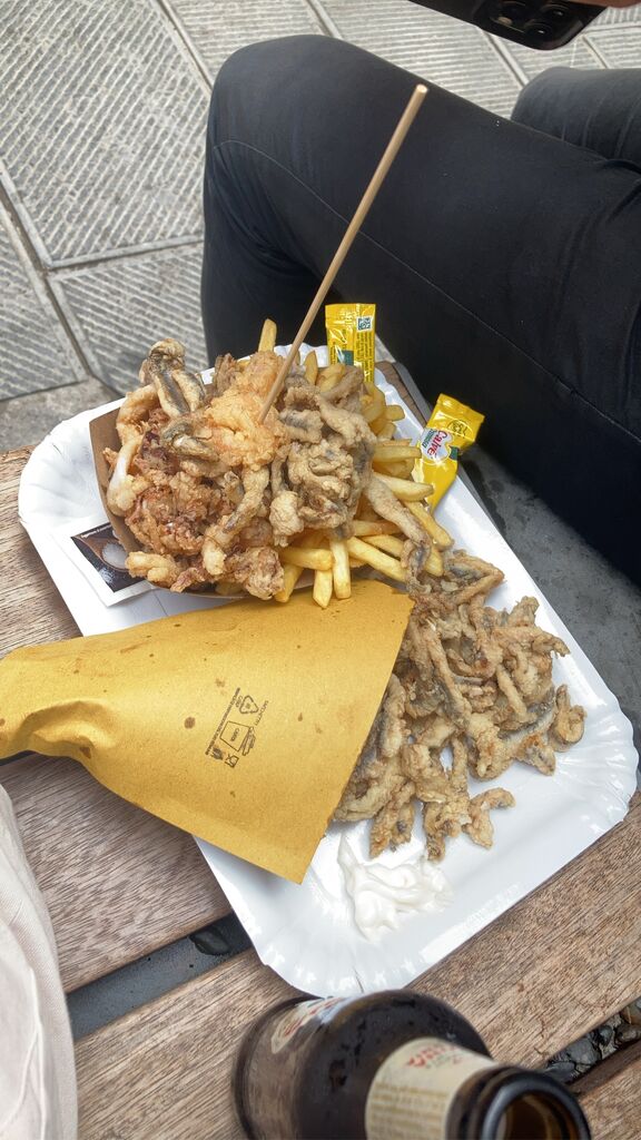 當地的炸海鮮攤,鴿子一直在旁邊待命等著吃掉下來的食物,還弄破了一個玻璃杯,超恐怖