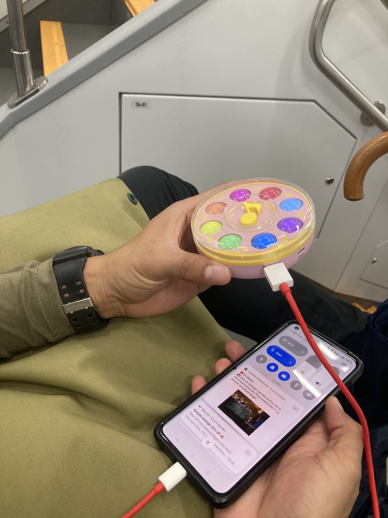 用小魔女do re mi行動電源的男人.jpg 他的行動電源好像是可以插很多的那種,所以很厚、很重,他就懶得帶出來