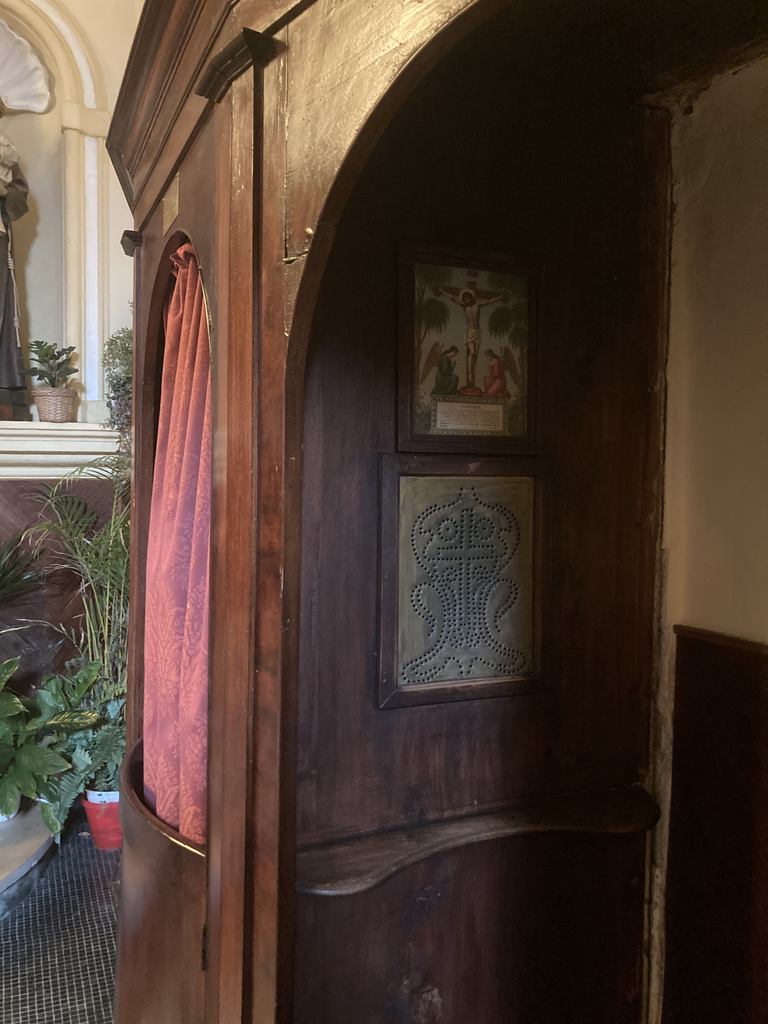 一路往上爬有一間教堂,第一次親眼看到神父我有罪的告解小空間。