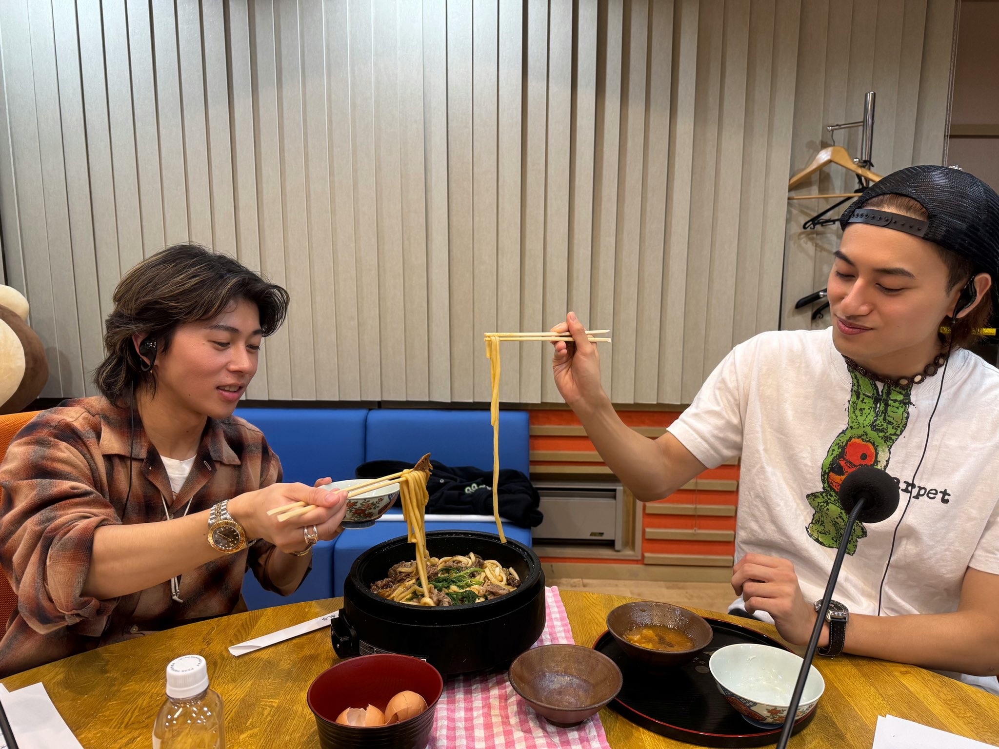 禮拜三錄影一整天的樣子,餓壞的兩人一開鍋的時候跟看到ボーカリスト端出白飯的歡呼真的有夠真摯的www 稀哩呼嚕邊吃邊聊天的廣播開場talk15分鐘,我簡直在聽高中生情侶的居家約會的餐桌閒聊w 小島邊吃邊亂回話情緒有夠高漲 末澤也是邊吃邊吐槽 太快樂了吧