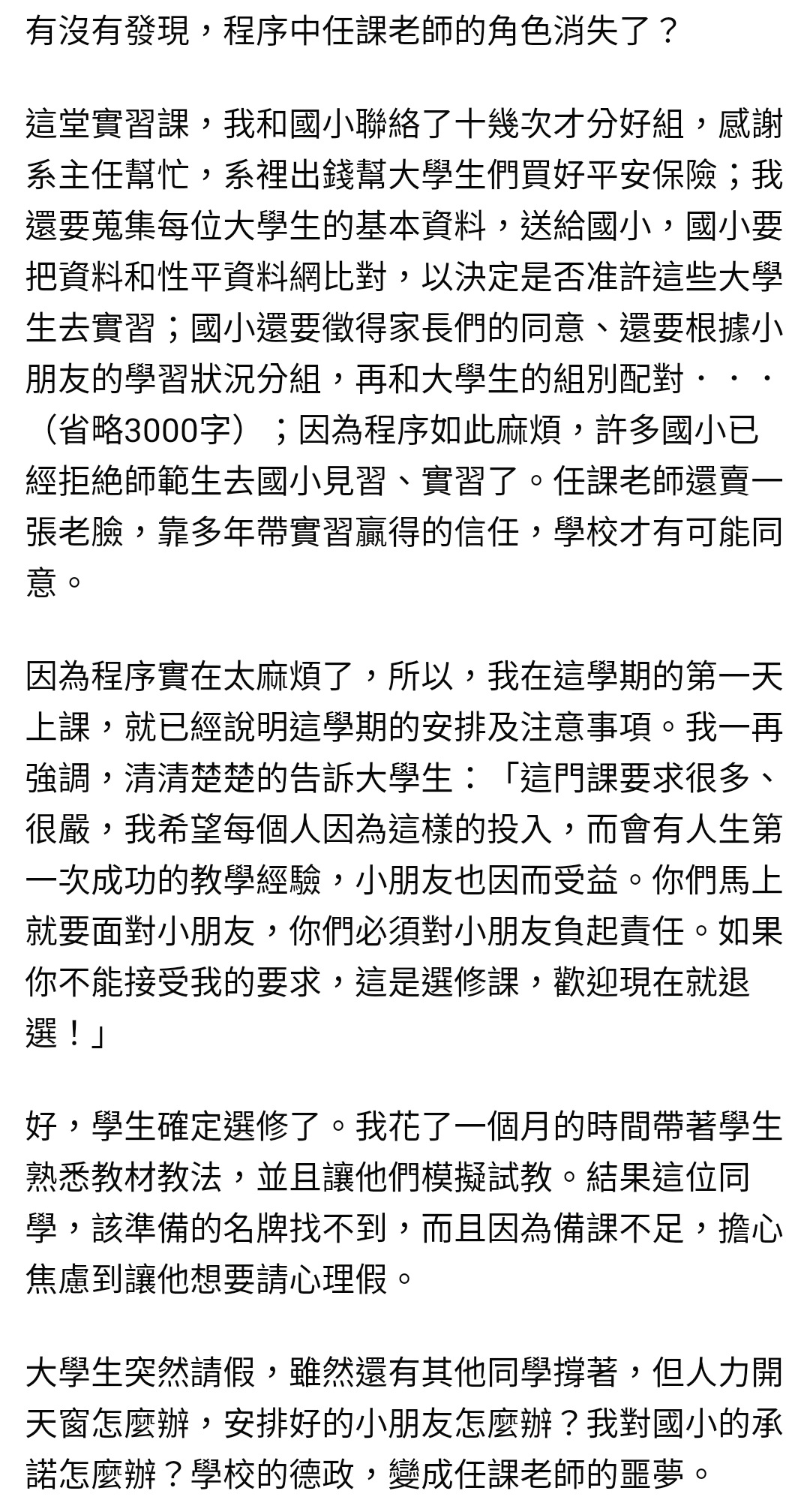 當事人的請假會影響到別人。任課老師的信用、等待當事人授課的學生、當事人的組員、雙方的學校等等