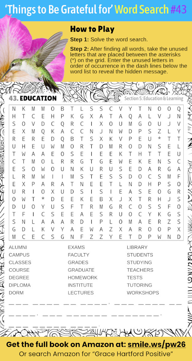 📚 Dive into this Education Gratitude word search! Find words honoring learning and uncover a hidden thankful rhyme that fuels curiosity. Grow thankful. Search Amazon for "Grace Hartford Positive" for the full collection. WordSearch Puzzles Gratitude Learning