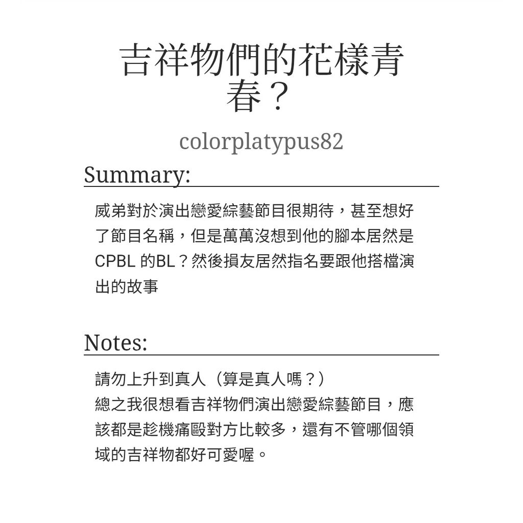 吉祥物們的花樣青春? - colorplatypus82 - Fandom RPF [Archive o...