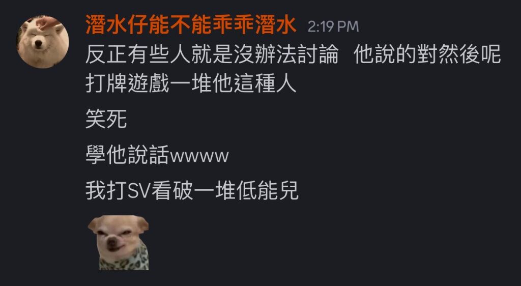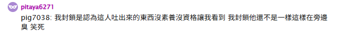 : 別人發言還要限制真的很可撥小圈圈,裡面一堆這種亂嗆或槓精行為,難不成要當網路廢人一直洗存在感才能講喔