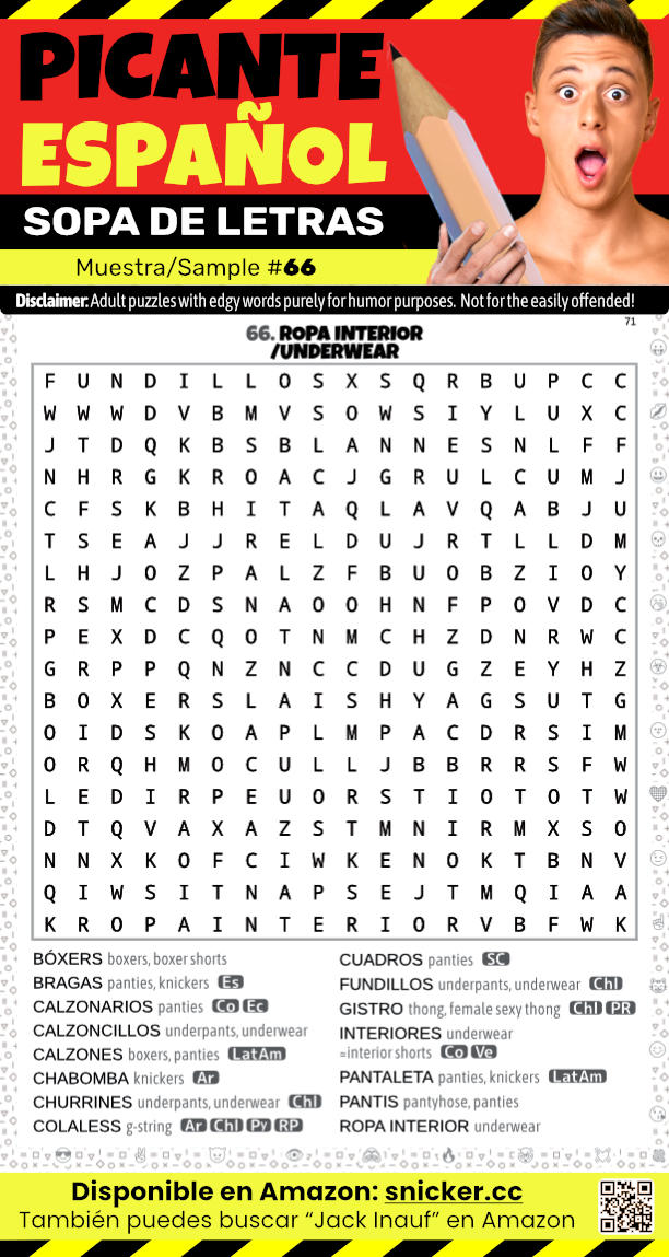 🩲 ¡Este wordsearch celebra la ropa interior con palabras subidas! Resuelve este puzzle sexy. 😏 Busca “Jack Inauf” en Amazon para el libro completo. puzzle humor slang español diversión juegos fun wordsearch Spanish NSFW AdultsOnly 18+ AdultContent