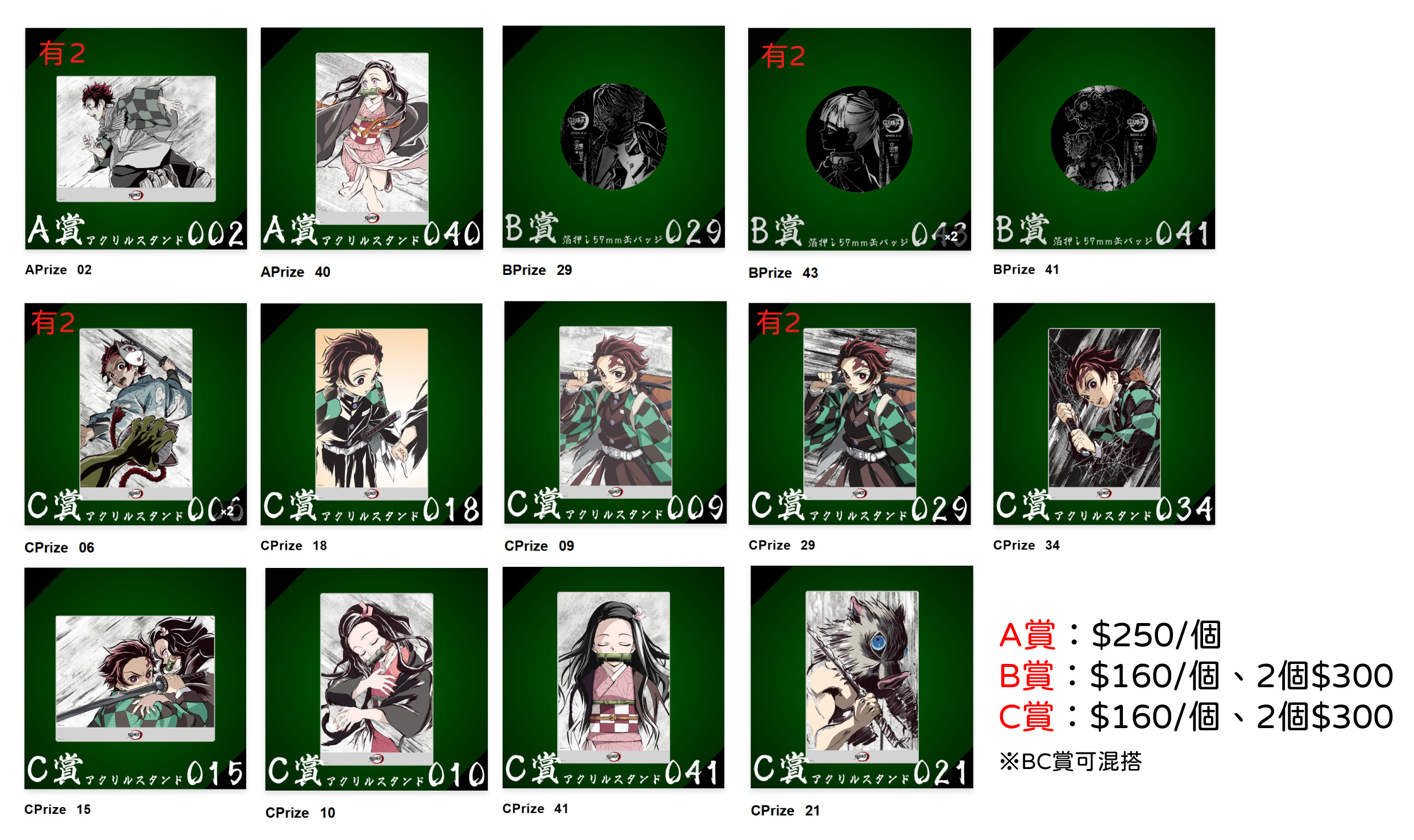 .A賞:$250/個 .B、C賞:$160/個、兩個$300