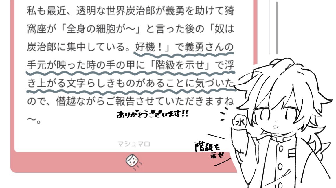反而覺得看到場景飛起的塵埃炭治郎打猗窩座開通透的時候,眼中的義勇手背上有浮現代表他隊士階級的字,只是一閃而過太快了,大家都沒看清楚到底是什麼字(水?柱?甲?感覺都有可能)