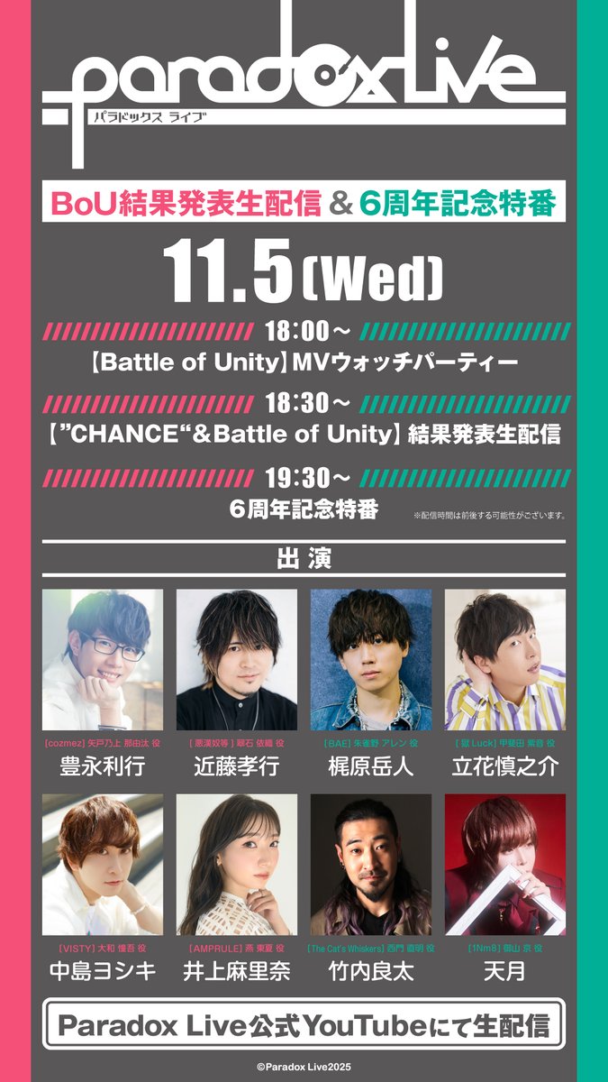 ※11/5(水)18時~※【Paradox Live】BoU結果発表生配信&6周年記念特番