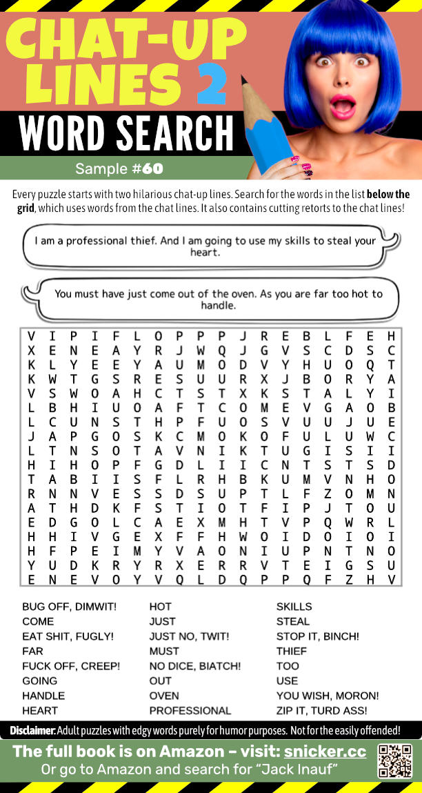 💋 Dive into suggestive chat-up lines with this amusing wordsearch full of clever and naughty vibes! 😉 Search “Jack Inauf” on Amazon for the full book to woo your way to more fun. puzzle humor flirt naughty wordsearch jokes slang NSFW AdultsOnly 18+ AdultContent