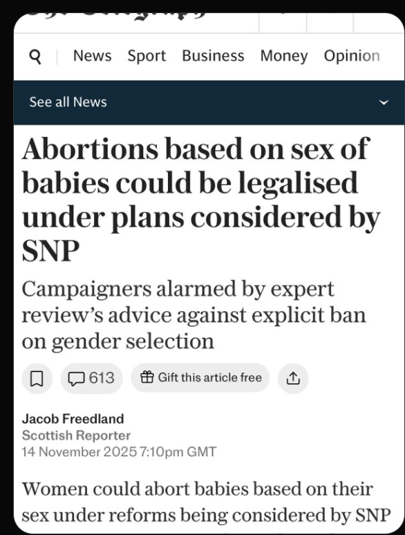 新聞連結 :【根據蘇格蘭民族黨正在考慮的方案,基於胎兒性別的墮胎可能合法化。】