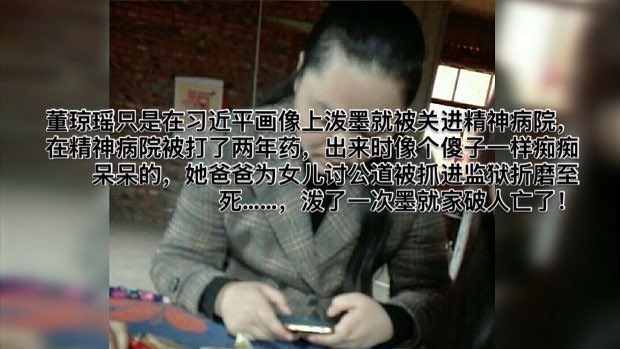 董琼瑶只是在习近平画像上泼墨就被关进精神病院,在精神病院被打了两年药,出来时像个傻子一样痴痴呆呆的,她爸爸为女儿讨公道被抓进监狱扬磨至死,泼了一次墨就家破人亡了!