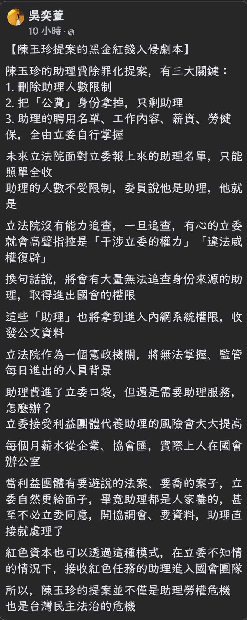 「未來立法院面對立委報上來的助理名單,只能照單全收