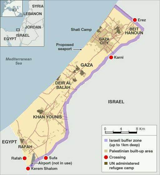 因為以色列在四周建造了通電鐵絲網圍籬,圍籬大約兩公尺高。距離此圍籬1-2公里的農田都不可以栽種農作物,這樣可以確保以色列觀察視野遼闊,任何人都不可以靠近圍籬,一但靠近會有以色列狙擊手射殺,進出都需要通過檢查哨。