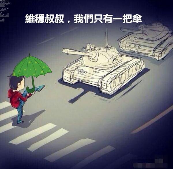 雨傘是代表我們市民只有雨傘 來抵擋警方的胡椒噴霧和煙霧彈 諷刺市民簡單的應急裝備與警察全副武裝的差異