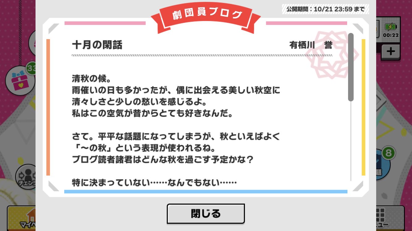 除了這模範一般的結構之外,把「秋天」「藝術」「演劇」做連結、一句之中不會使用兩個以上的標點、漢字與漢字間會注意不相連(*後述)都是寫作技巧的表現。簡單的說他是把blog當成寫給觀客們的正式問候信在執筆的感覺XD