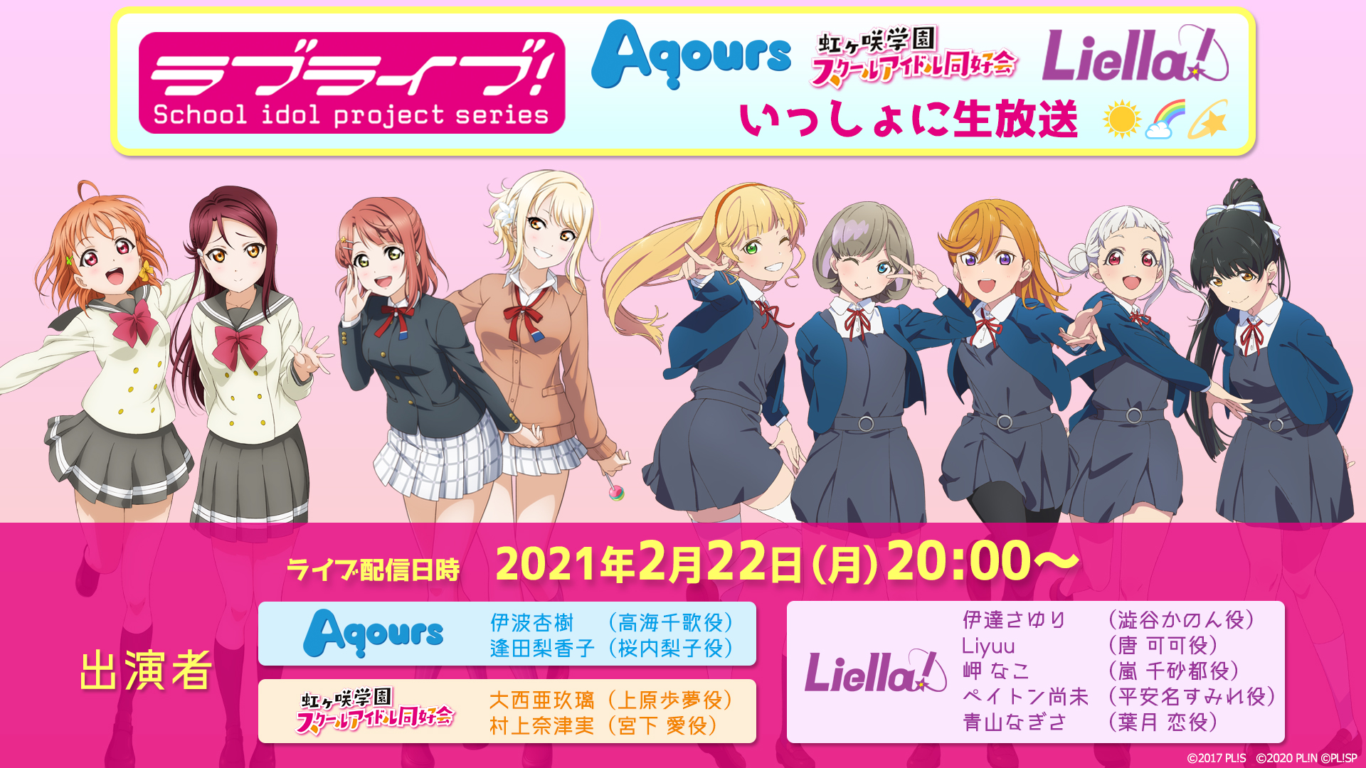 2月22日(月)20時に、Aqours・虹ヶ咲学園スクールアイドル同好会・Liella!が出演する生放送の実施が決定🎊