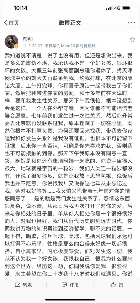 前中國網球國手彭帥發微博控訴被前中國國務院張高麗副總理權勢性侵
