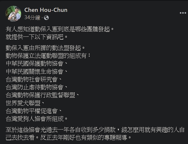 Chen Hou-Chun:有人想知道動保入憲到底是哪些團體發起。