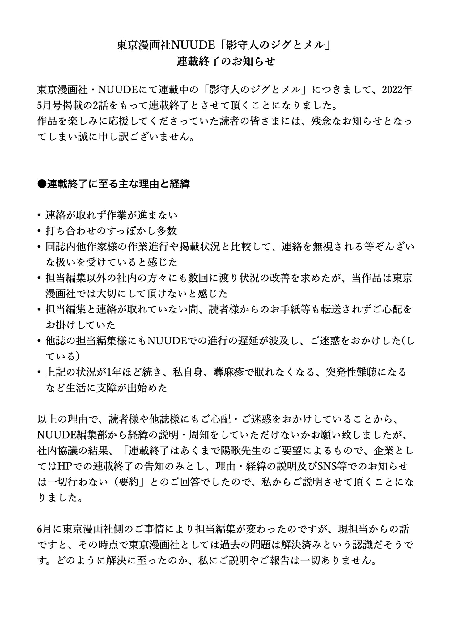 →8月陽歌老師在推上發表連載終止的經緯,列舉NUUDE編輯部和之間發的種種衝突
