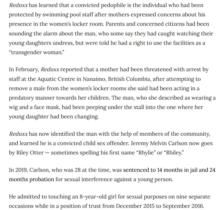 加拿大案件,機翻:當一位母親報告說,一名戴著假髮的男子試圖在加拿大不列顛哥倫比亞省的一個游泳池裡查看她女兒正在換衣服的隔間下面時,工作人員告訴她,她可能會因為與這名男子發生衝突而被捕,這名男子聲稱自己有存在於女更衣室的人權。